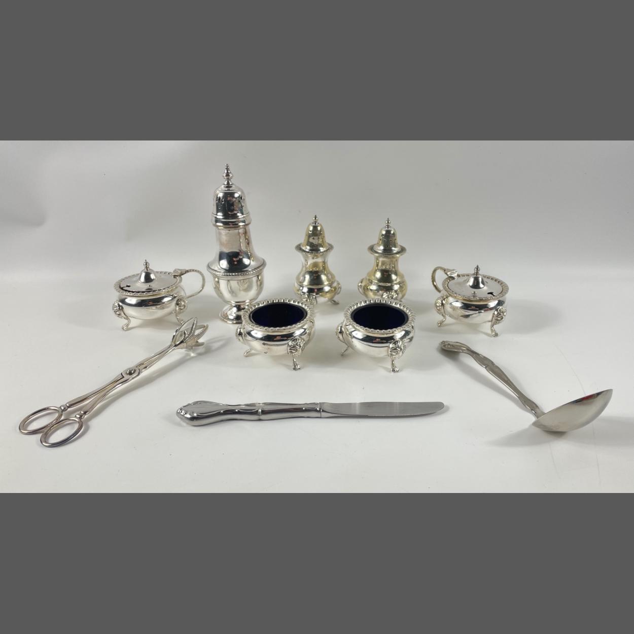 A nice EPNS condiment set to include salt, pepper, sugar sifter, sauce ladle, a pair of dishes with blue glass liner (5cm dia.) a pair of lidded dishes (5cm dia), and a pair of tongs