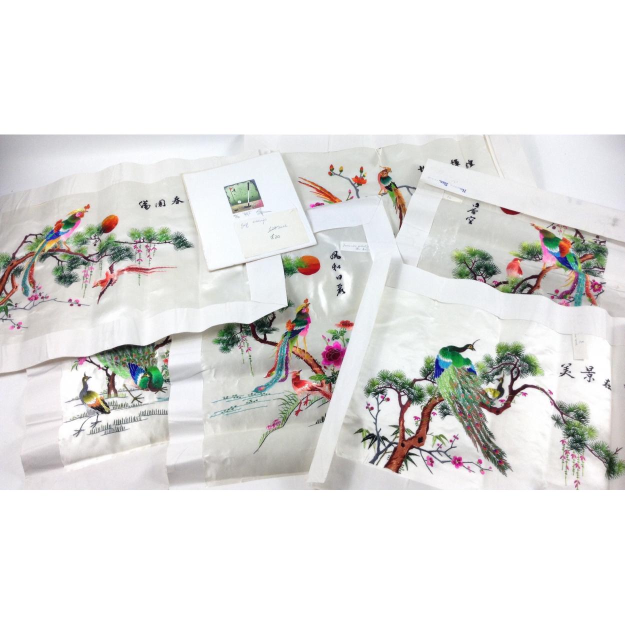 Six stunning silk embroidered pictures on a satin background with designs of birds including peacocks and parrots 43 x 28cm plus a golf etching 140/150 "Golf 1" signed in pencil but signature unclear