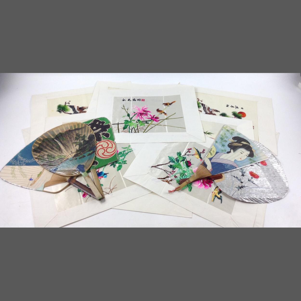 Eleven hand-embroidered silk paintings on the theme of birds picture size 30 x 23cm plus 5 bamboo fans mainly advertising various companies