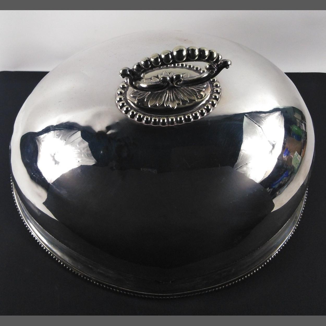 A large vintage white metal domed meat cover 46cm long and approx 30cm high, surface has a few small dents commensurate with its age
