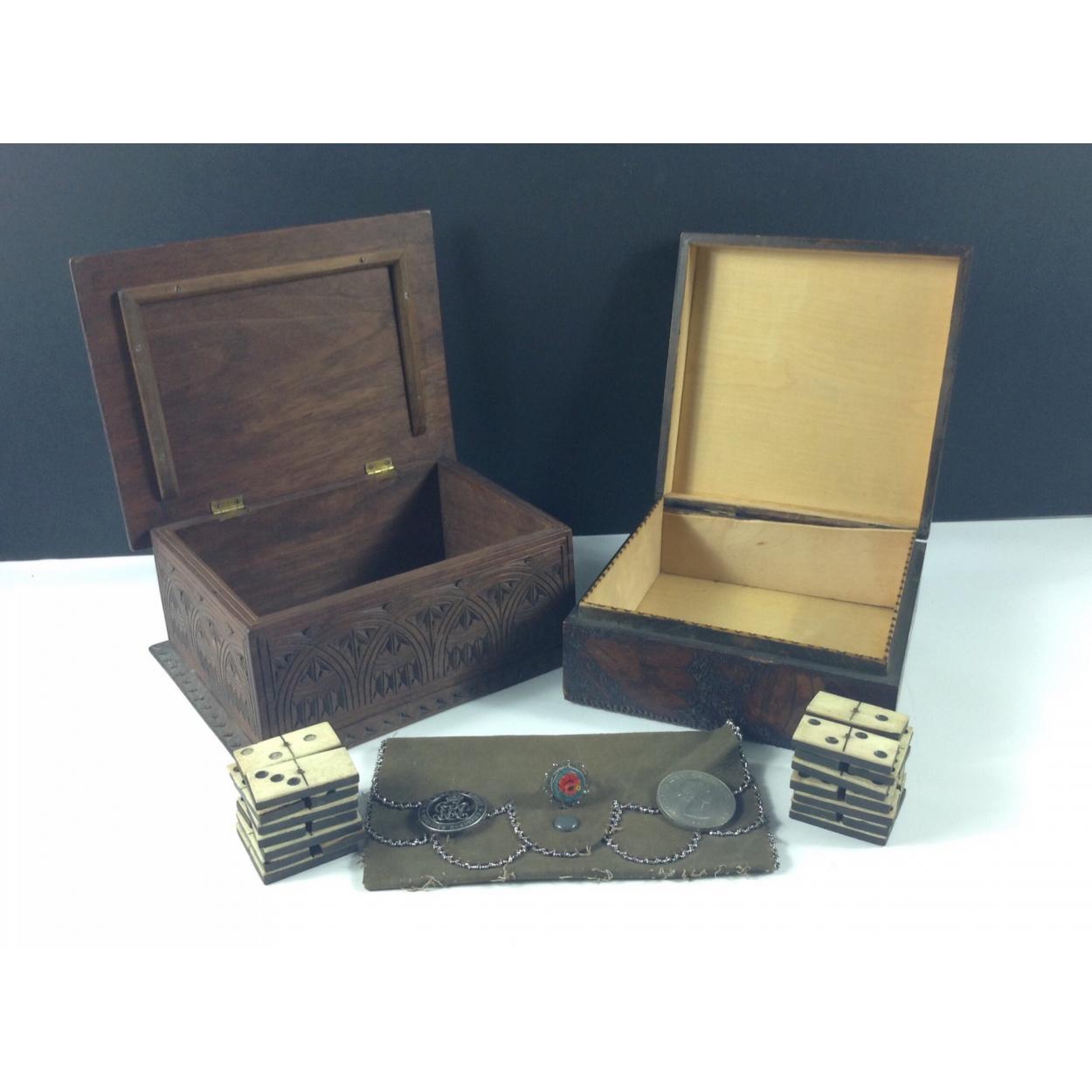 A QUALITY mixed lot to include 2 carved wooden boxes, the first with a crocus design being 18 x 18 x 8cm, the other 22 x 17 x 9cm with a geometric pattern plus box contents