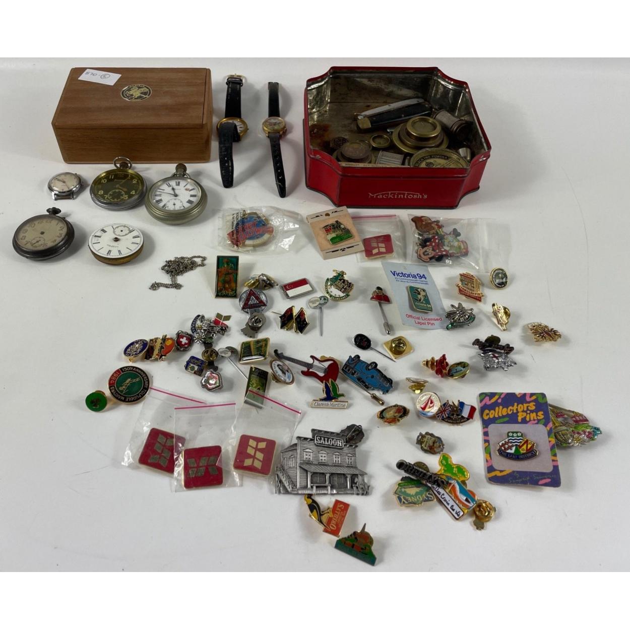 A mixed lot to include 4 pocket watches including an American Waltham Watch Co from 1897 (missing lots of bits), a collection of pin badges from around the world including Planet Hollywood, Paris, and a box of curios including brass imperial weights ranging from 1/2oz to 8oz, a tin of blue black ink powder from the company of Henry C Stephens etc
