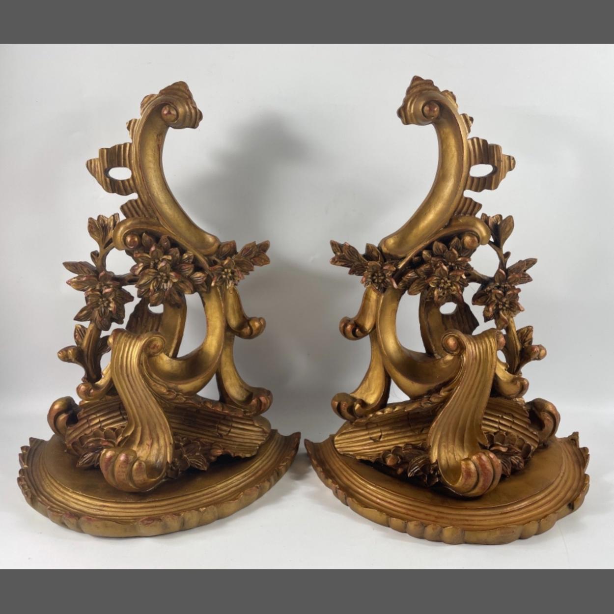 A gilded pair of HEAVILY CARVED wooden wall-mounted demi-lune shelves in gold length of shelf at rear 33cm, length of piece approx 47cm