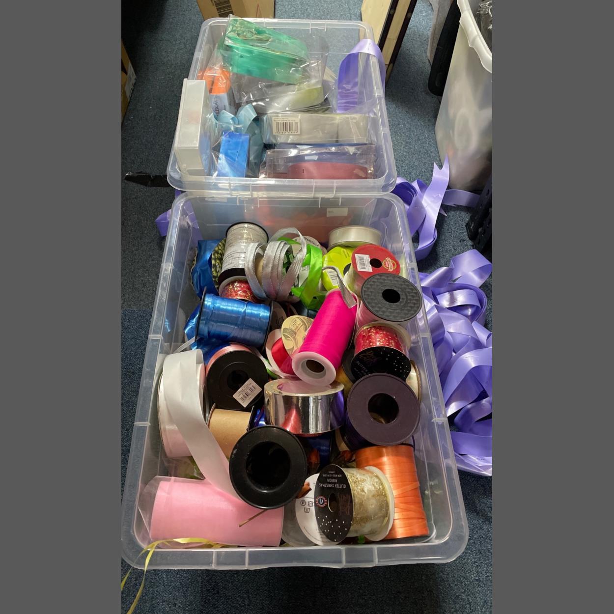 Two large boxes of ribbons for a florist in a rainbow of colours and widths