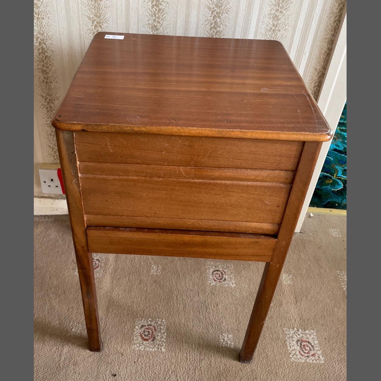 A RETRO teak lidded SEWING work-table for storage etc and a small bottom drawer dimensions top 40cm square x 60cm height