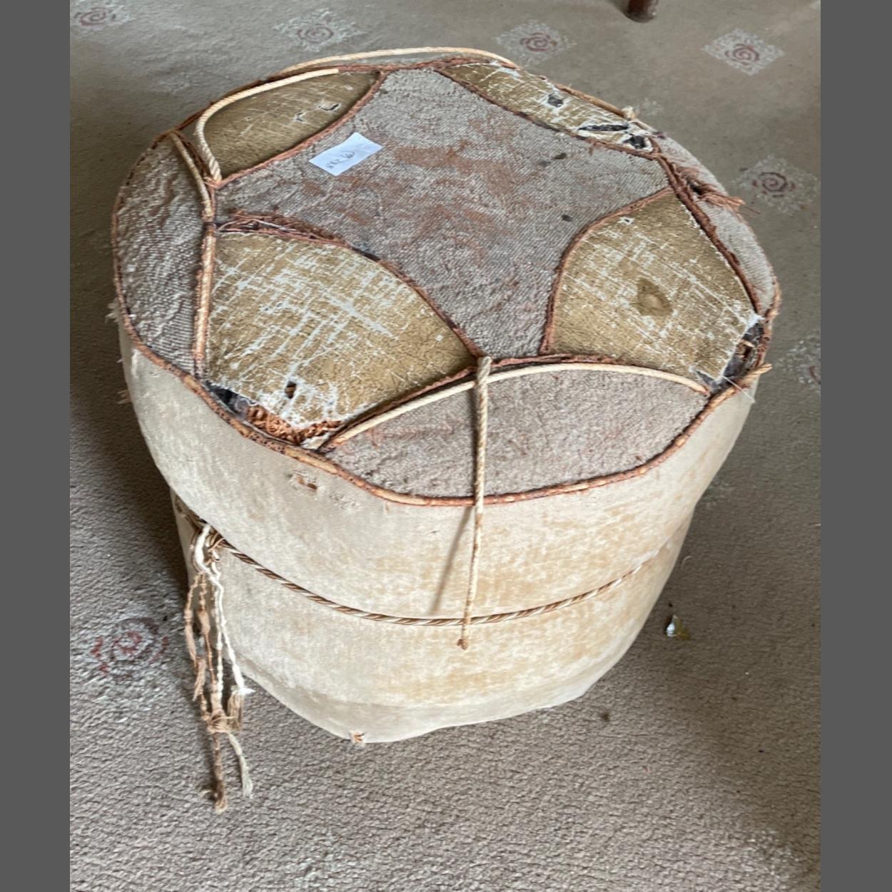 A vintage c1930's stuffed pouffe requiring tlc dimensions 36cm diameter x height 26cm