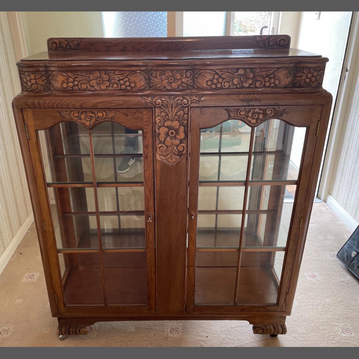 A c1950's hand carved display cabinet with three display shelves length 103cm x depth 39cm x height 130cm