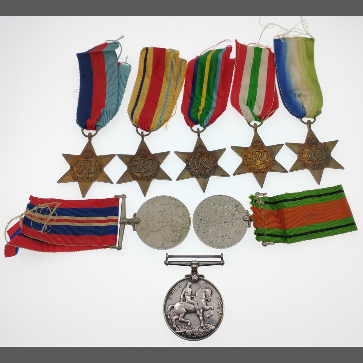 A collection of service medals to include 1914-18 awarded to Lance Sergeant John Baker of the South Staffordshire regiment, the 1939-45 DEFENCE MEDAL with ribbon, the 1939-45 SERVICE MEDAL with ribbon, the 1939-45 STAR with ribbon, the AFRICA STAR with ribbon, the PACIFIC STAR with ribbon, the ITALY STAR with ribbon, the ATLANTIC STAR with ribbon