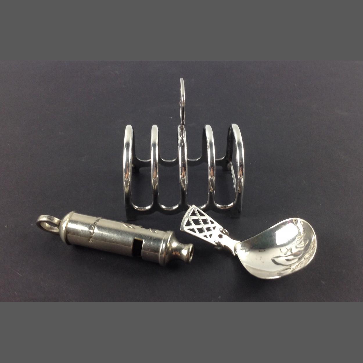 THE SMALLEST AND CUTEST EP toast rack I've ever seen! 7cm length x 8cm high approx with a small tea caddy spoon and a VINTAGE KINGLET branded pocket whistle 9cm long approx