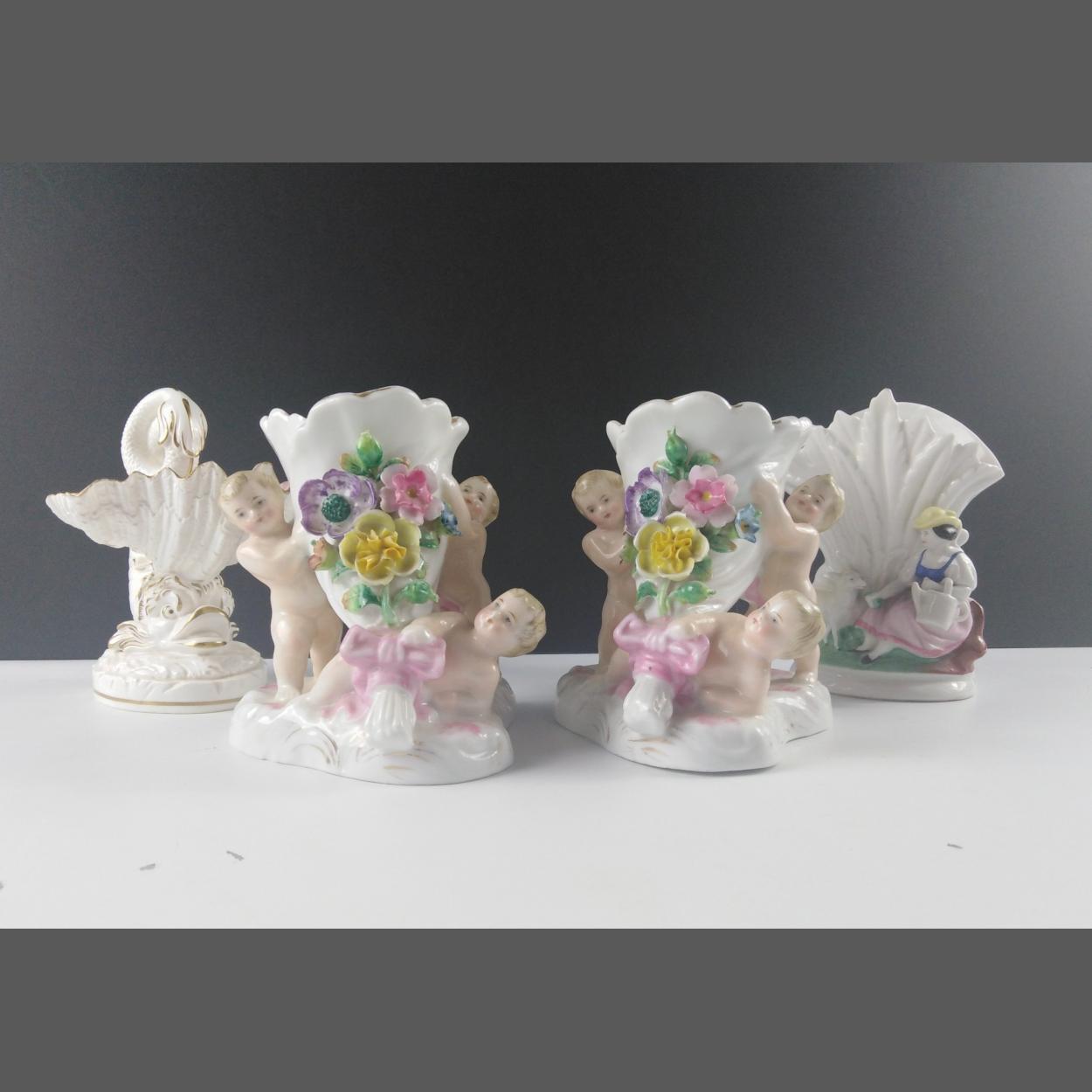 A pair floral decorated HORNS OF PLENTY supported by 3 cherubs, no maker's mark, height 13cm, also a VASE with a rustic maiden and lamb (no maker's mark) height 14cm, and a shell-shaped DISH supported by a fish (no maker's mark) 15cm high