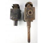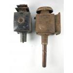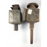Vintage - two old lamps the larger being for a horse carriage (height 46cm), the other ( height 30cm) adapted for electricity (one pane of gass cracked)