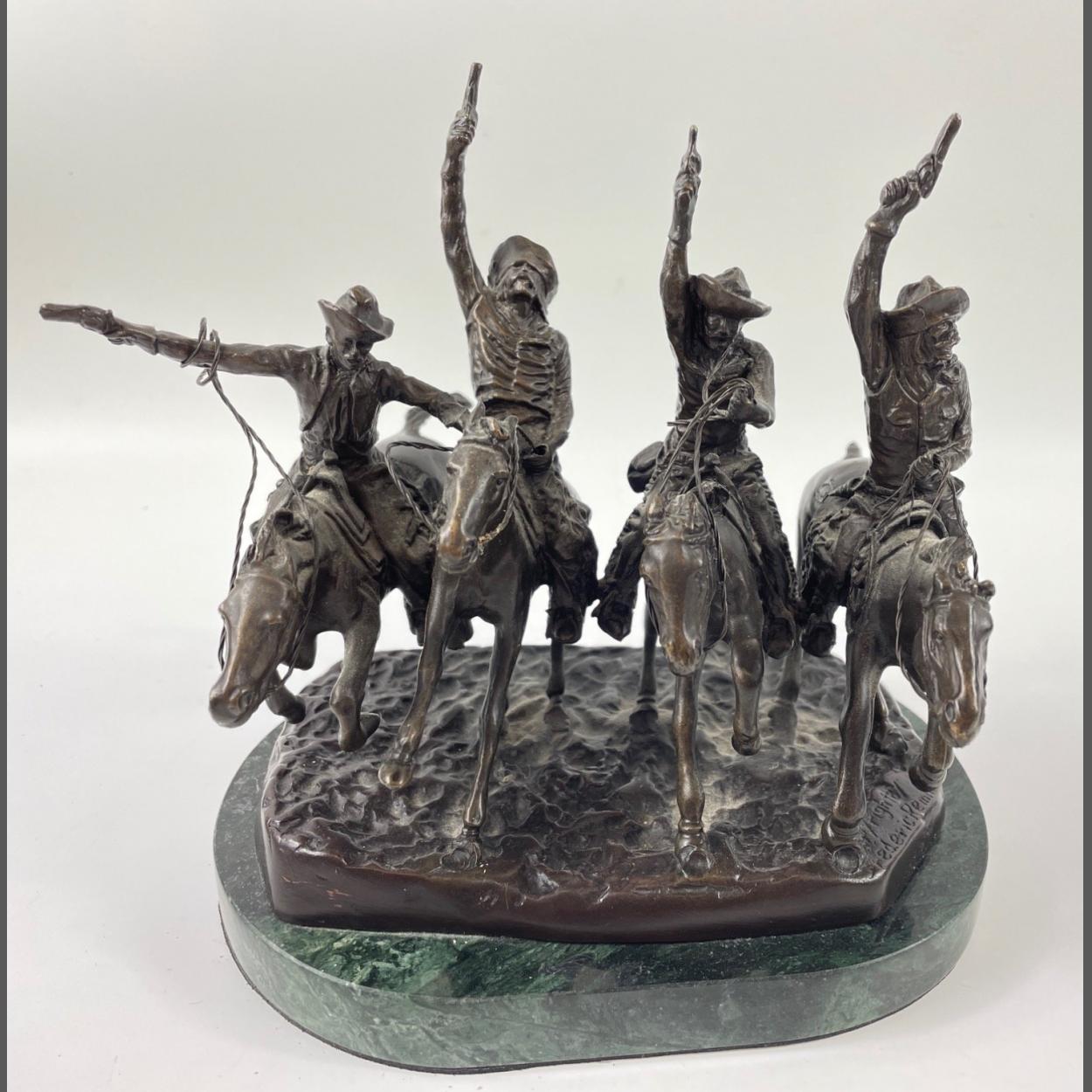 SUPER COLLECTABLE Coming through the Rye - A group of four bronze mounted cowboys on a marble plinth stamped 'copyright by Frederic Remington', standing approx 20cm