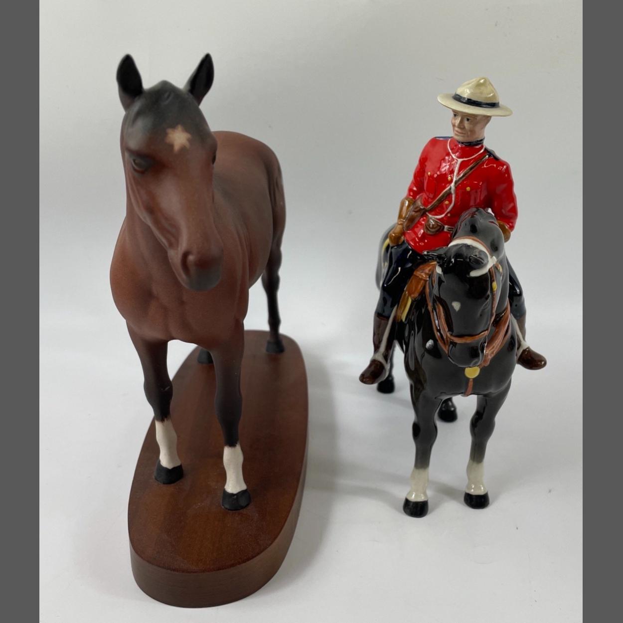 Two equine figures to include a ROYAL DOULTON 23cm high horse on a wooden plinth and a MOUNTIE on a black horse standing 22cm high, no maker's mark (damage repaired to rear horse's leg),