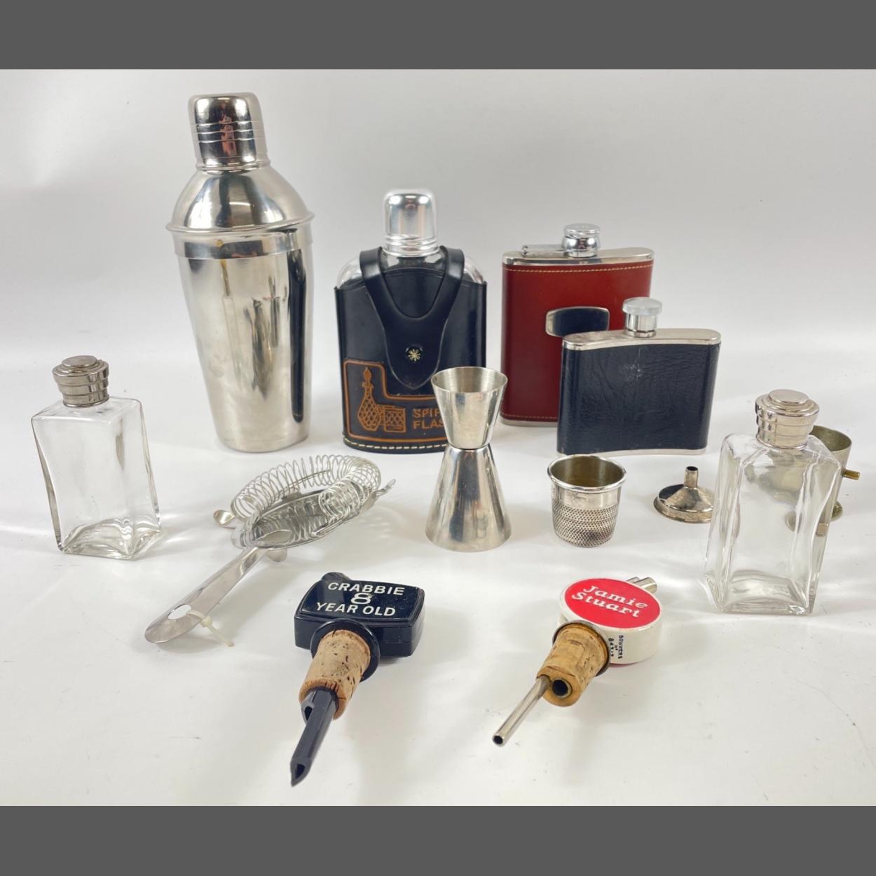 A collection of drinking accroutrements to include 2 hip flasks 6oz and 4oz size, a leather cover for a quarter bottle of spirits, a cocktail shaker plus various measures etc,