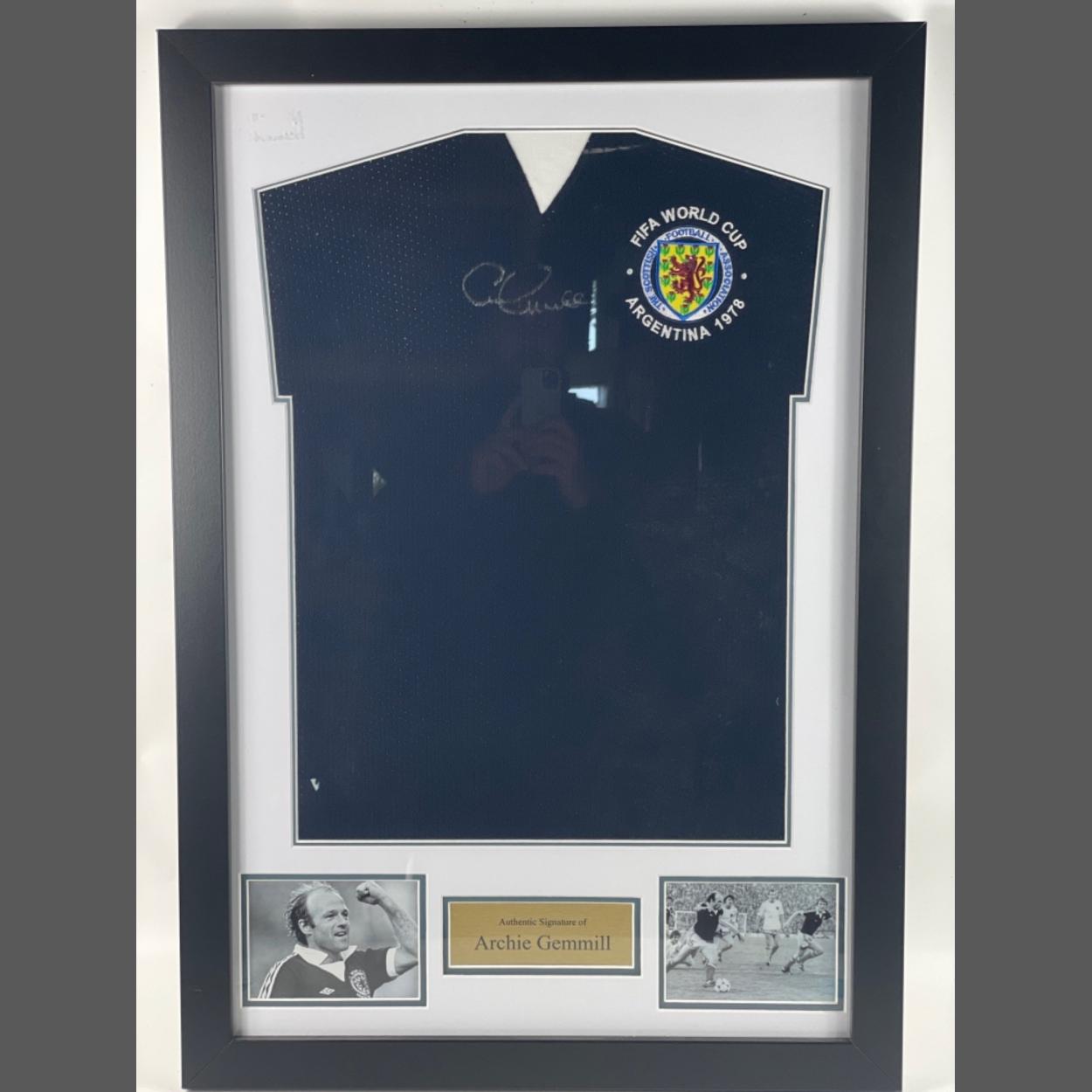 A football shirt from Argentina 1978 signed by Archie Gemmill frame size 83 x 57cm, style matches the Charlton picture