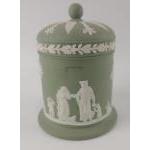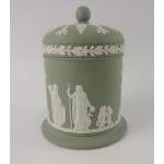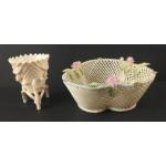 A mixed lot of china etc to include a boxed 2-tier Minton cake stand, a boxed Portmeirion cake slice, a Belleek clover shaped openweave basket (15cm dia), a Belleek 3 legged pot (8cm high approx) , a Wedgwood Jasperware lidded pot (10cm high approx)