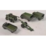 DINKY toys 1 x model 621 3-ton army wagon, 1 x model 623 army wagon, 1 x model 661 recovery tractor, 1 other army wagon with no Dinky label, 1 x model 693 field gun. All unboxed, and are in play-worn condition