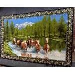 Two US made TAPESTRY AFGHANS 130x173cm one called 'Fillin' up on memories', the other is a winter scene of children ice-skating, plus a wall hanging of horses crossing a river 150x100cm and a prayer-mat size rug of riders with camels and a donkey