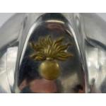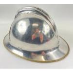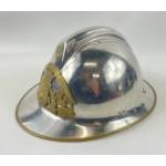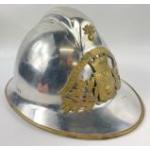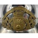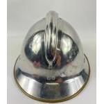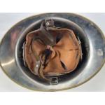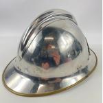 A VINTAGE French Fireman's steel helmet with the coat of arms in brass stating