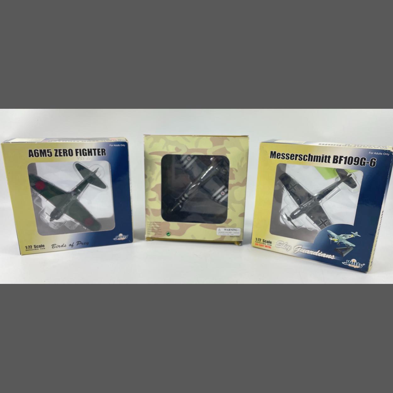 Three collectable scale die-cast models in original boxes to include WITTY WINGS Hawker Seafury 1:72 scale FB-11 as new condition, also a WITTY WINGS die-cast model MESSERSCHMITT BF109G-6 model 1:72 scale as new condition and lastly a WITTY WINGS Birds Of Prey Series A6M5 ZERO FIGHTER scale 1:72 boxed as new condition