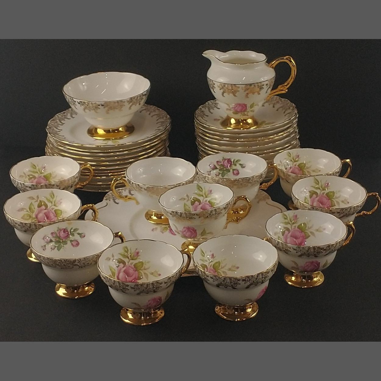 A vintage ROSINA china tea service with a rose pattern and gilt scalloped edges to include 11 cups, 12 saucers, 12 side plates, 2 sandwich plates, 1 milk jug and 1 sugar bowl