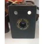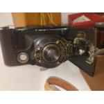 A box of vintage cameras to include A boxed AGFA KLEBEPRESSE film splicer with insruction booklet, also a No 2 KODAK folding camera with canvas carry-case, a ZEISS IKON NETTAR folding camera (with Novar Anastigmet printed on the outer lens) also a negative viewer, also an original canvas carry cased KODAK POPULAR BROWNIE camera