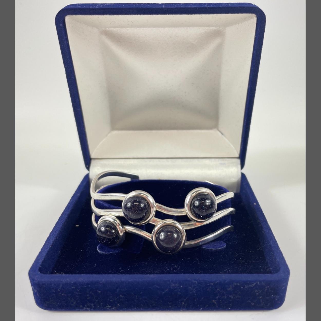 A boxed ladies wave effect white metal bangle set with 4 purple circular stones, gross weight 28gm