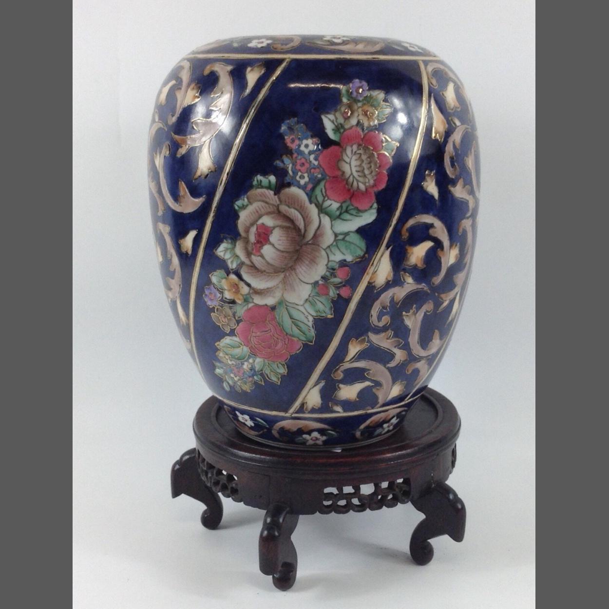 A large Chinese blue floral vase on a wooden stand, vase measures 22cmH, 18cm W, stand measures 8cmH and 16.5cm Dia
