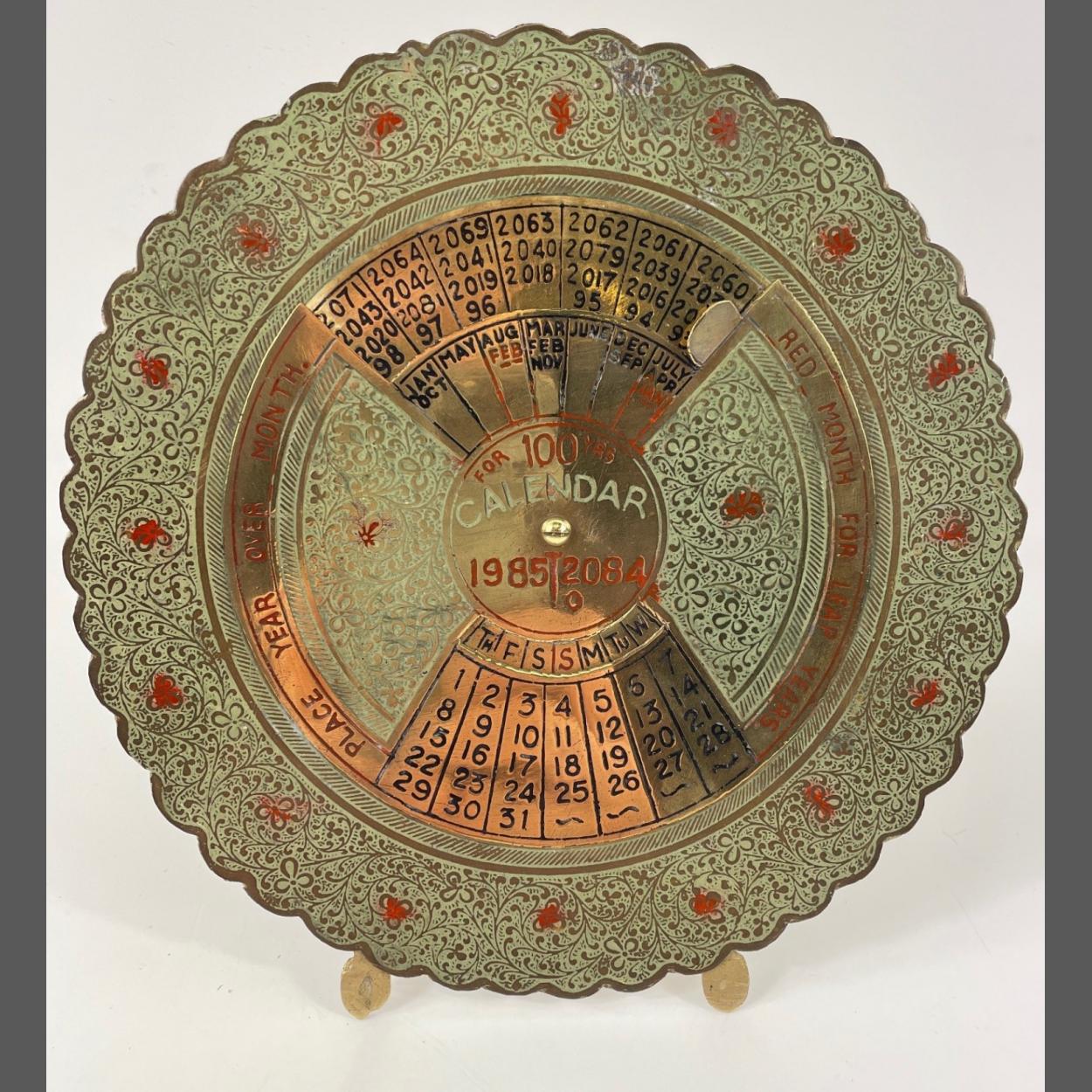 A brass perpetual calendar for 100 years 1985-2084, 17cm dia.