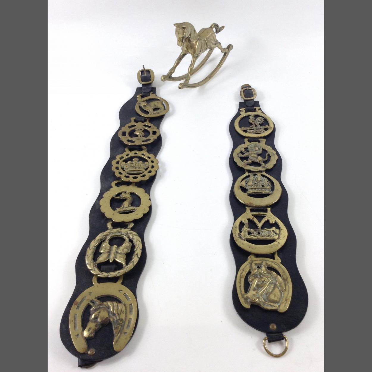 Two sets of horse brasses 1with 5 brasses, the other with 6 plus a brass rocking horse 19Lx14cmH