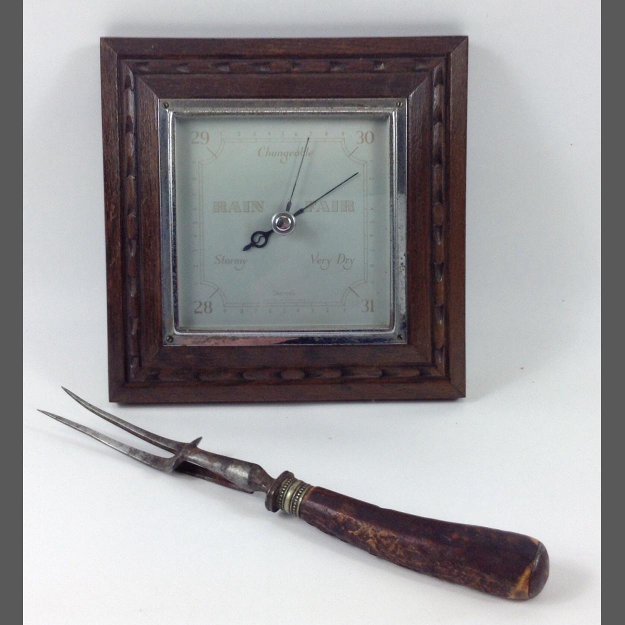 A vintage SMITHS OF ENGLAND wall-mounted barometer and a vintage horn-handled serving fork 26cm long