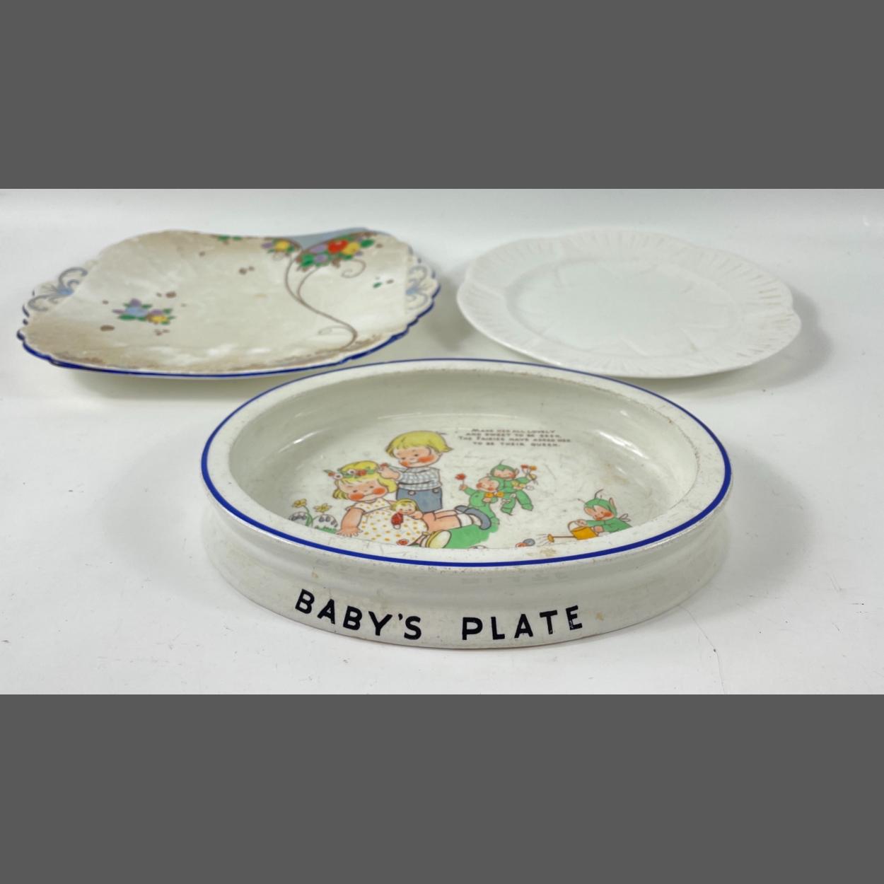 A vintage SHELLEY Mabel Lucie Attwell Baby Plate 'Make her all lovely and sweet to be seen, the fairies have asked her to be their queen' 20x15cm (chip from under-rim), a vintage SHELLEY square dish 25x25cm, a white SHELLEY plate with scalloped edges (21cm dia),
