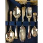 A canteen of cutlery by JAMES LODGE Ltd to include 6 knives @23cm, 6 knives @ 21cm, 6 EPNS soup spoons, 6 EPNS dessert spoons, 6 EPNS forks 19cm long, 6 EPNS forks 17cm long, 6 EPNS teaspoons, 6 EPNS coffee spoons,1 EPNS serving spoon, plus a carving knife, steel and carving fork, box measures 44x29x7.5cm