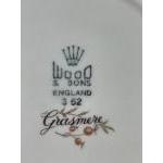 A part WOOD and SON GRASMERE dinner service to include 6 x 25cm plates, 6 x 23xm plates (2 with a small chip to rim), 1 x 20cm plate, 3 double-handled soup bowls, 1 sauceboat with underplate, 1 ashet (31cm), 6 saucers, 2 lidded serving dishes (26cm wide)