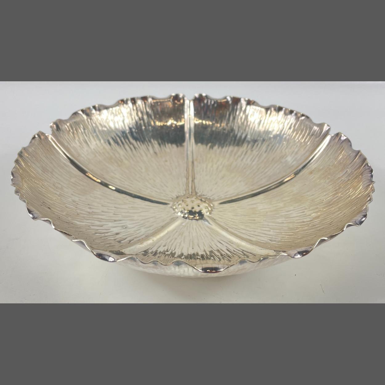 A vintage HUKIN & HEATH silver plated Arts & Crafts bark lily bowl designed by DR CHRISTOPHER DRESSER, 21cm dia
