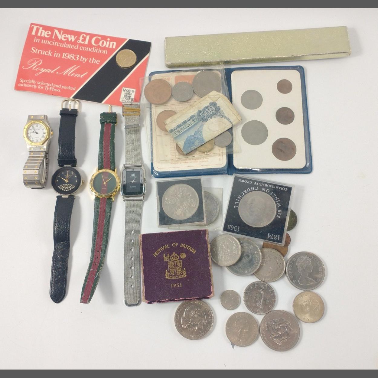 A collection of mainly British & World coinage to include also Britain’s First Decimal Coins set sleeve, a FESTIVAL OF BRITAIN 1951 Silver Crown and three wrist watches etc