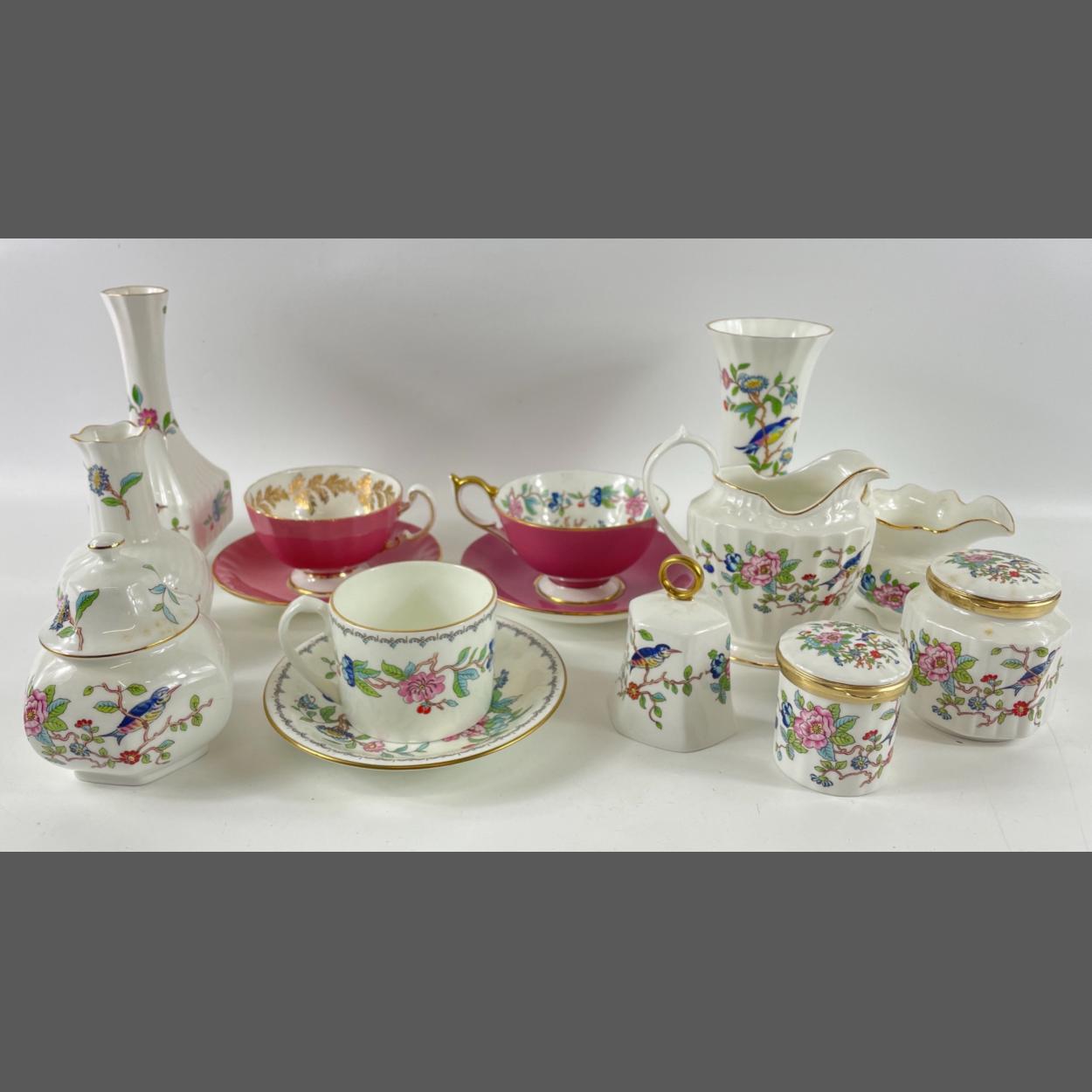 A collection of AYNSLEY china with the PEMBROKE pattern to include a square posy vase (18cm), a round posy vase (13cm high), another vase 16cm high, 2 jugs 13cm, the other 9cm, a mini ginger jar (11cm high), 2 dresser jars with hinged lids 1 @ 8cm the other 6m high, a bell 8.5cm, plus 3 cups and saucers (one not Pembroke design),