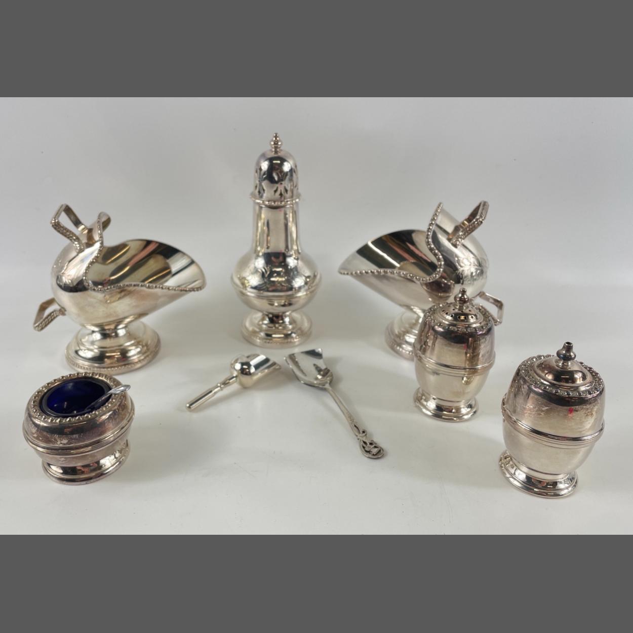 NICE QUALITY! A mixed silver plate and white metal lot to include a condiment set of salt, pepper and mustard with blue liner, 2 silver -plated sugar scuttles with a scoop and a spoon, and a silver-plated sugar shaker (17cm high)
