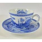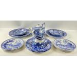 From the SPODE BLUE ROOM COLLECTION to include 3 bowls (14cm dia) from 'Girl at well', 4 cups and saucers (15cm), 5 plates (19cm), 1 plate (26cm), from 'Rome', 1 plate (26cm) from 'Woodman', also from the MICROWAVE AND DISHWASHER SAFE collection Spode design C1816 2 plates (27cm), 2 bowls (16.5cm), 1 milk jug, 1 teapot