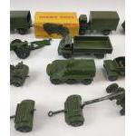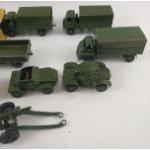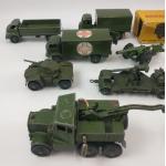 VINTAGE MILITARY DINKY toys 2 x model 621 3-ton army wagon, 1 x model 623 army wagon, 1 model 626 military ambulance, 1 x model 692 5.5 medium gun, 2 x model 670 armoured cars, 1 x model 673 scout car (with 2 figures), 1 x armoured personnel carrier, 1 field gun on trailer, 2 x 25 pr gun trailers, 1 x model 623 army wagon, 1 x model 661 recovery tractor, 1 other army wagon with no Dinky label, 1 x model 693 field gun. All unboxed, and are in play-worn condition. 1 boxed ARMY COVERED WAGON model 623. Some very slight damage to paintwork. Box only retains one flap.