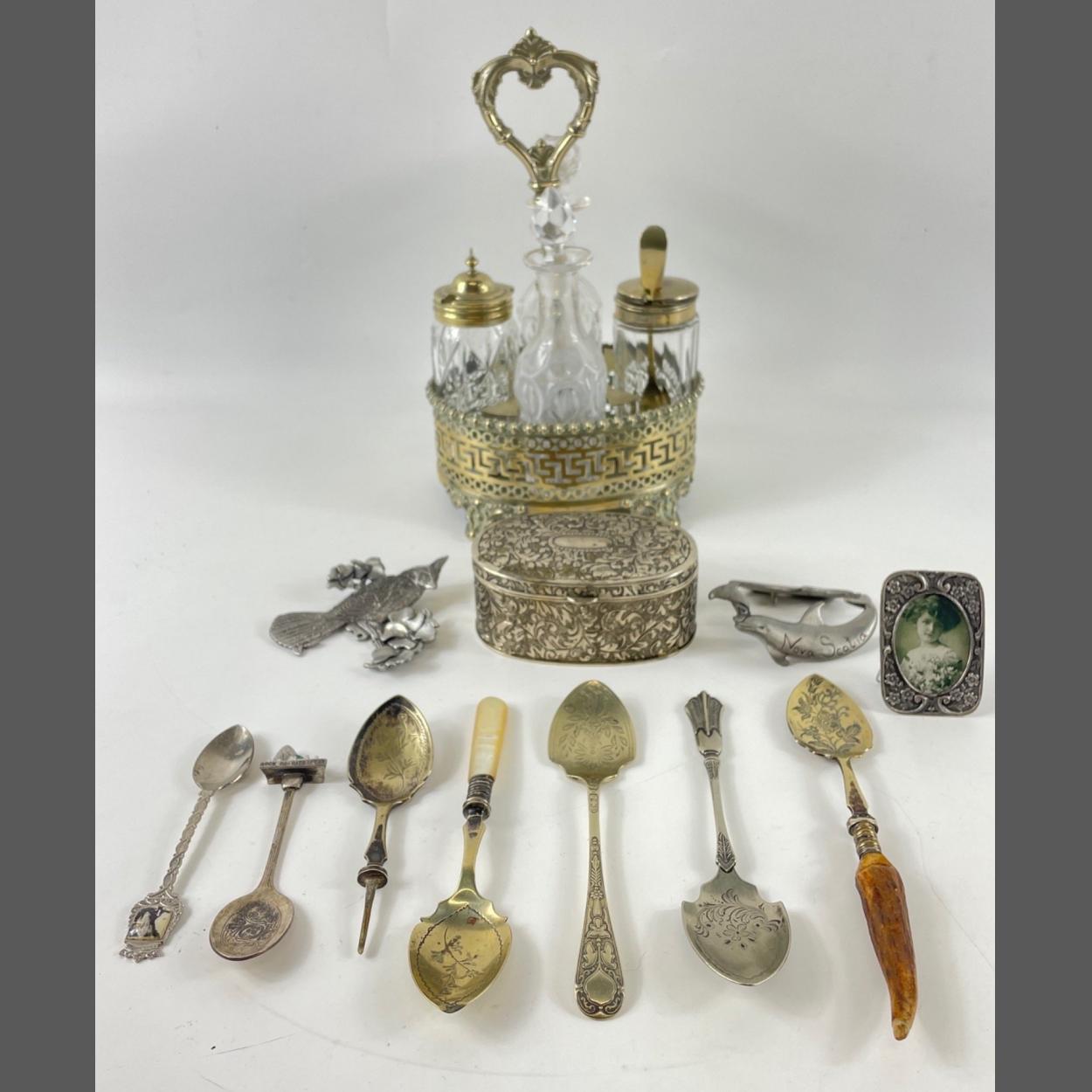 A mixed metalware lot to include an ENESCO picture frame 6x4.5cm, a 4 piece vintage condiment cruet set, a lidded trinket box with red velvet lining 11x7x5cm, a selection of jam spoons, some EPNS, a collector's spoon from Gibraltar stamped silver (gross weight 31g)