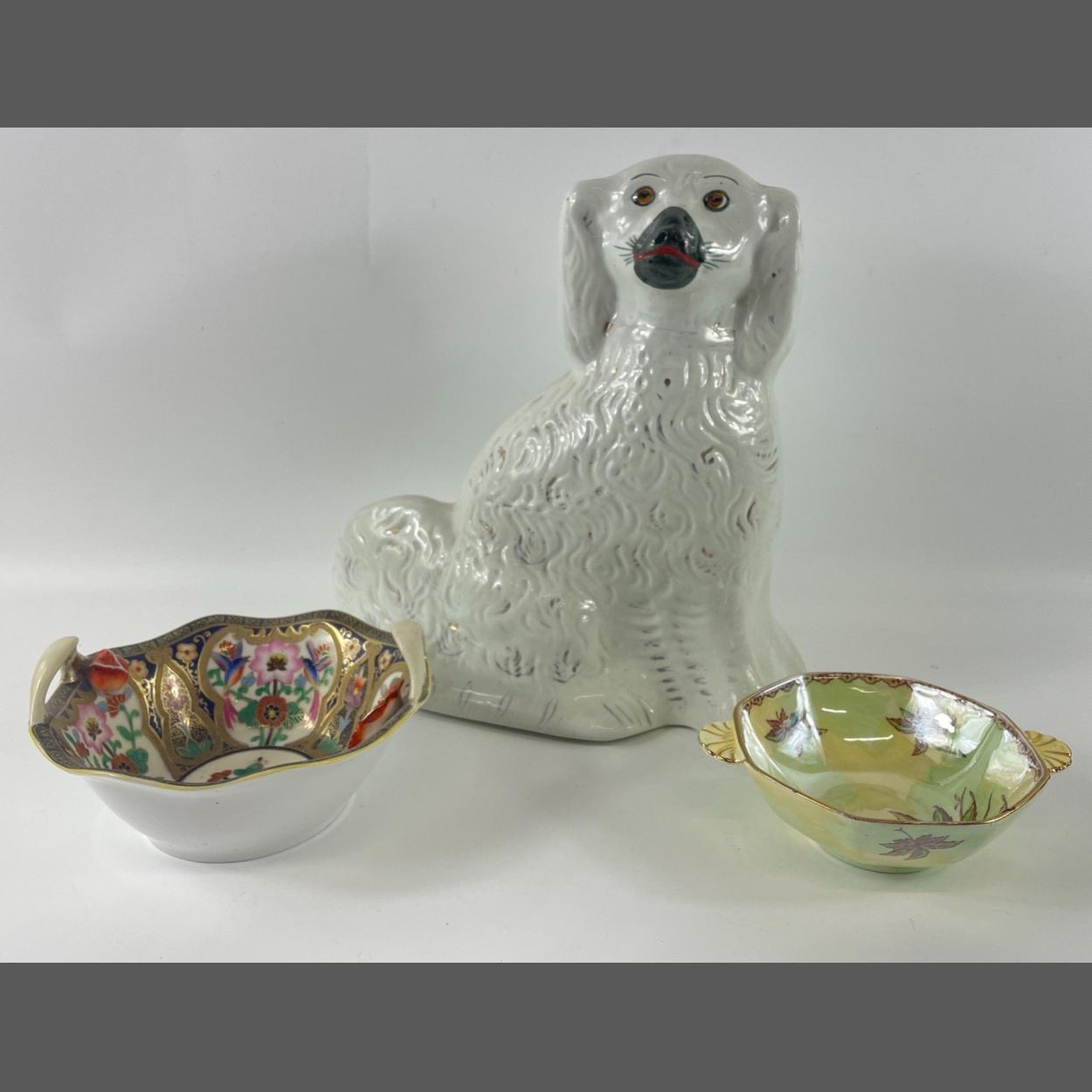 A ceramic flatback mantle dog with hand painted eyes and face 30cm tall x 26cm wide(at base), no chips or cracks noted, also a MALING 'Golden Spray ' pattern dish with twin handles and lastly an ANTIQUE hand painted floral pattern NORITAKE twin handled bowl dimensions 18cm diameter