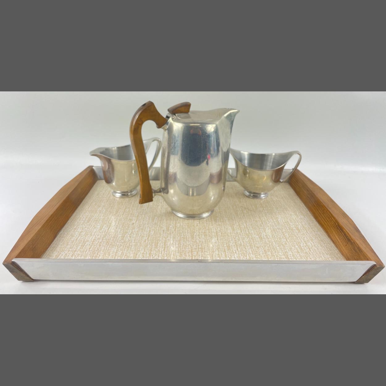 ICONIC! A part PICQUOT ware set to include a hot water pot, a milk jug, sugar bowl and comes with teak twin handled tray
