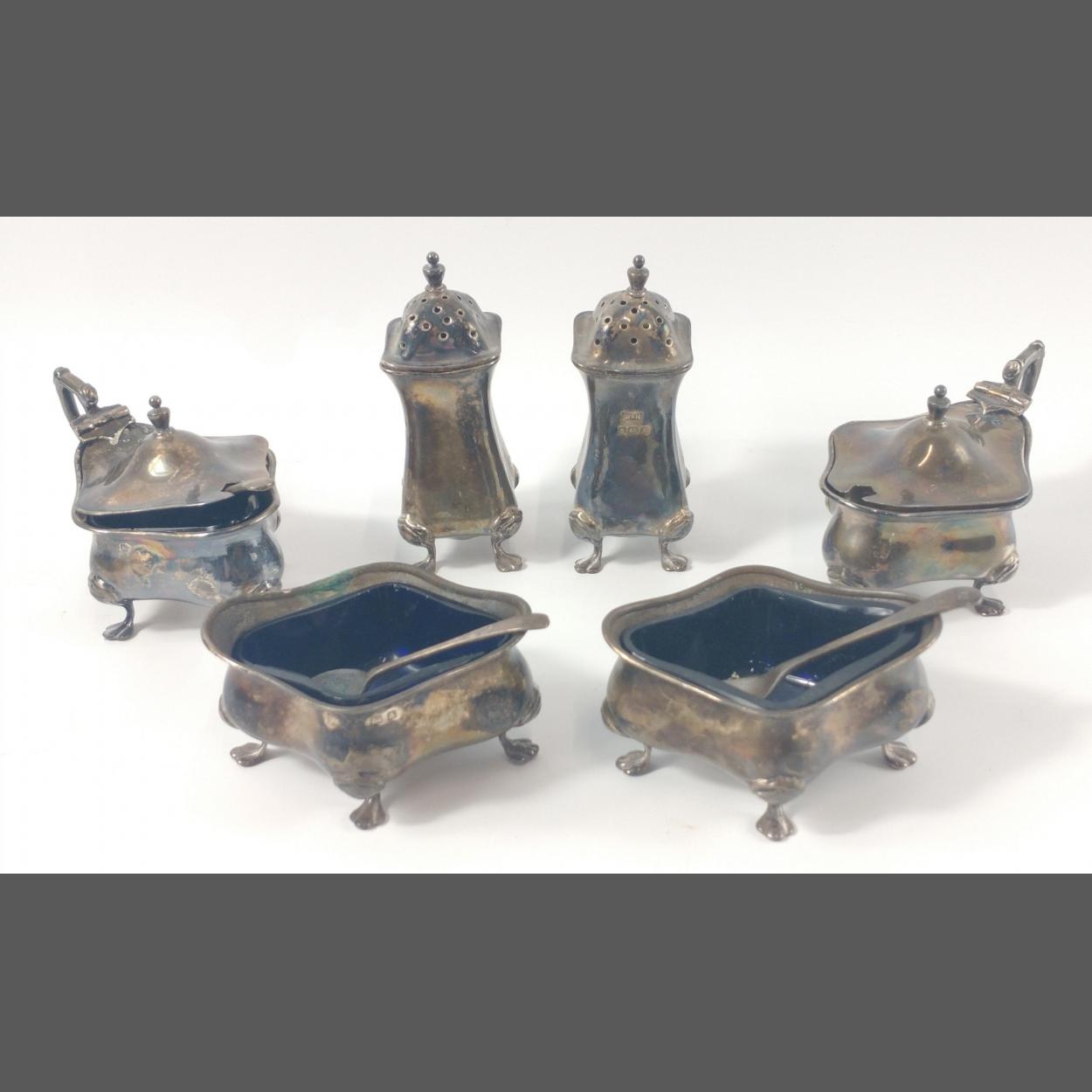 A silver Birmingham Hallmarked 1925 WALKER and HALL Cruet set, most with blue glass liners(one missing) salt and pepper and mustard spoon. Silver weight 188g, gross weight 237g