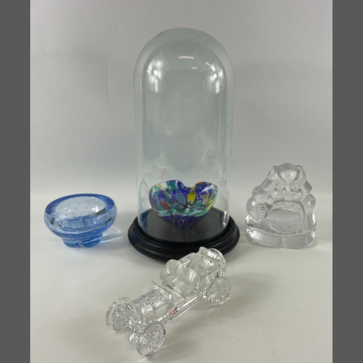 Collection of glassware to include Murano trinket dish (W: 12cm), domed stand (H: 34cm not include stand), blue bubble glass trinket dish, model car, SKRUF heavy book end