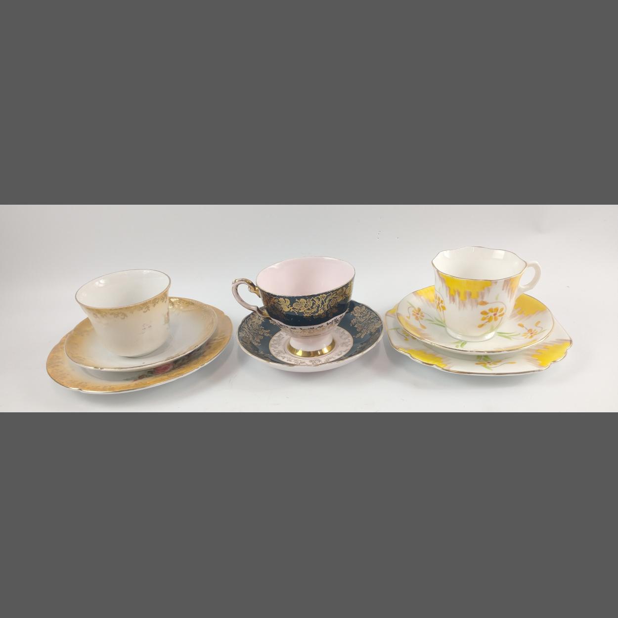 VINTAGE c1930's MELBA Fine Bone China yellow floral pattern ONSIE set comprising of a teacup, saucer and side plate, with also another bone china ONSIE trio with lastly a Fine Bone China TUSCAN cup and saucer
