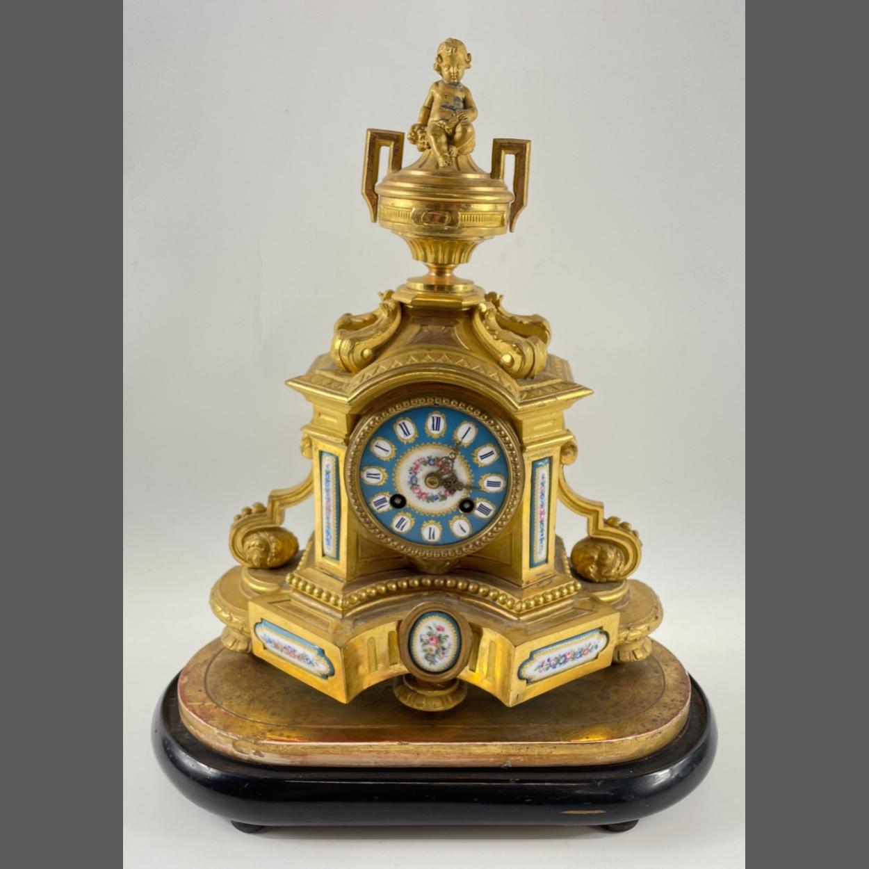 ANTIQUE c19th Century Ornate gilded FRENCH mantle clock with cherub finial and sky blue face. Decorated with blue and red flower pattern on face and sections on body