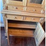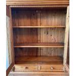 A lovely antique pine style glazed dresser with spiral carved ends with glazed doors with three shelves space,and four drawers for storage and two generous cupboard doors - 210cm height x 120cm length x 50cm depth (splits into two halves for ease of transport)