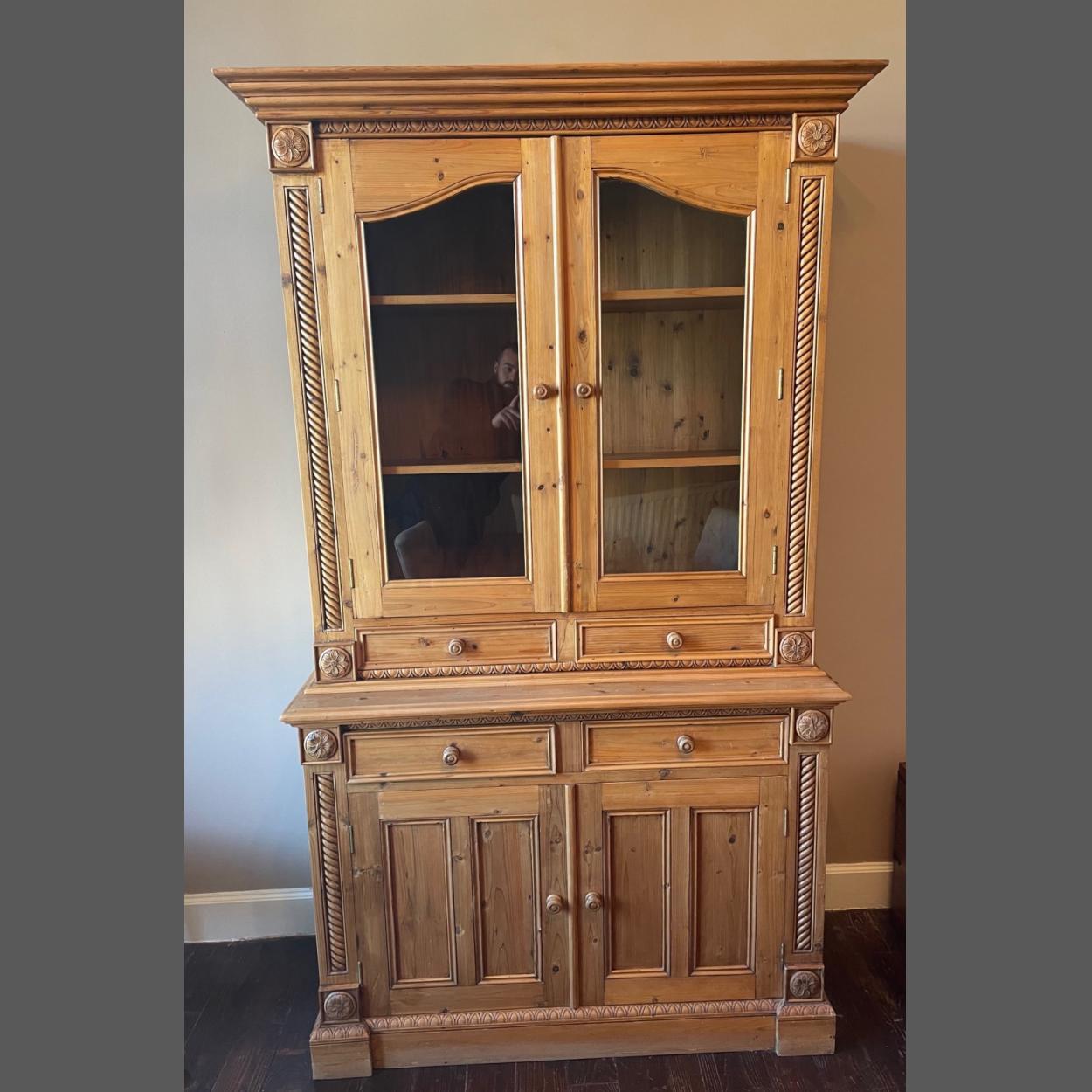 A lovely antique pine style glazed dresser with spiral carved ends with glazed doors with three shelves space,and four drawers for storage and two generous cupboard doors - 210cm height x 120cm length x 50cm depth (splits into two halves for ease of transport)