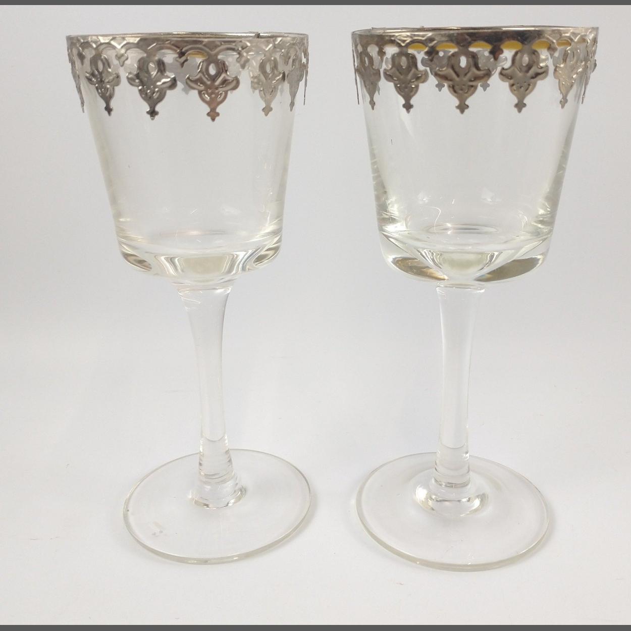 UNUSUAL! A pair of white metal FRETWORK rimmed goblet style wine glasses - dimensions 18cm tall x 8cm diameter approx